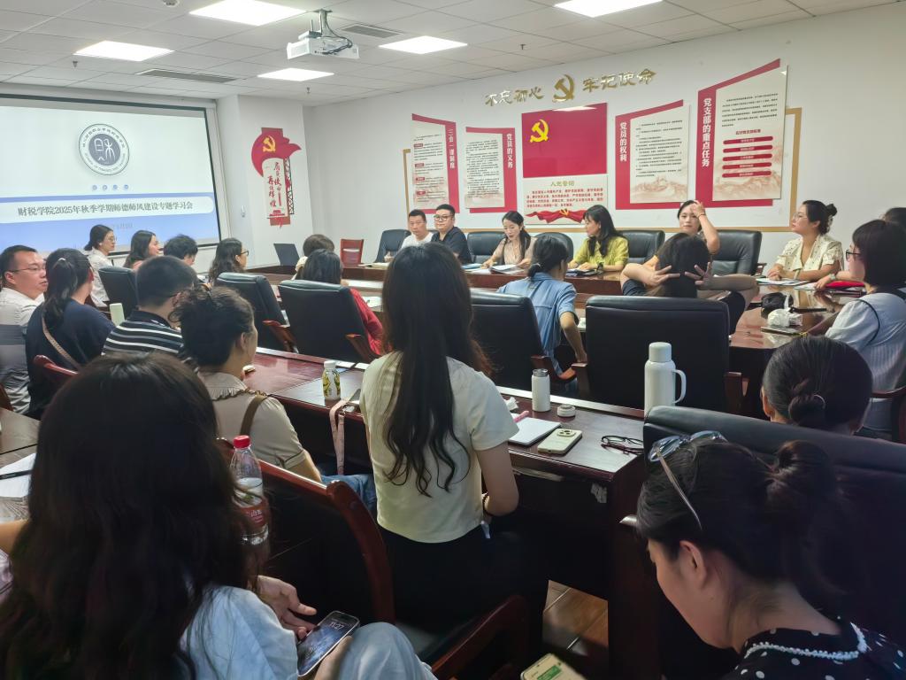 为深入贯彻党和国家关于新时代教师队伍建设的最新要求,筑牢立德树人思想根基,9月3日,财税学院于明德楼512会议室开展弘扬教育家精神,筑牢师德根基——2025年秋季学期师德师风建设专题学习会。会议由财税学院党总支书记陈露主持,学院全体教师参会。