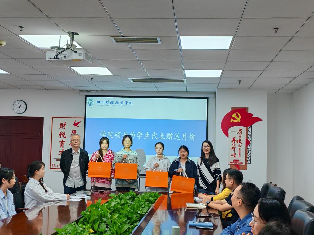 交流环节之后,活动进入了中秋慰问时刻。学院领导亲自向学生代表们赠送了象征团圆与祝福的中秋月饼,小小的月饼承载着学院对学子们的深切关怀与浓浓情意。