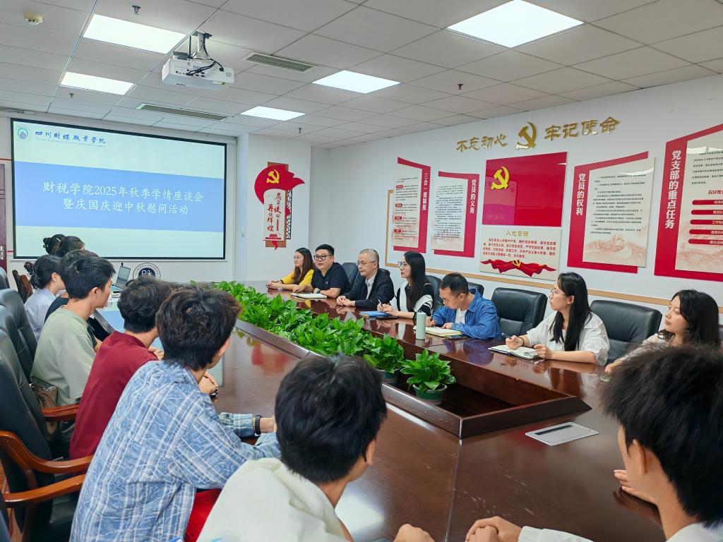 秋高气爽,丹桂飘香。为深入了解新学期学生的学习动态与思想状况,同时庆祝中华人民共和国成立76周年及中华民族的传统佳节——中秋节,财税学院于9月28日中午,在明德楼512教室举行了“2025年秋季学情座谈会暨庆国庆迎中秋特别活动”。本次活动由财税学院组织,团总支书记季宁宁担任会议主持,学院领导、辅导员老师与财税学院各年级学生代表齐聚一堂,共话学业发展,共迎双节到来。