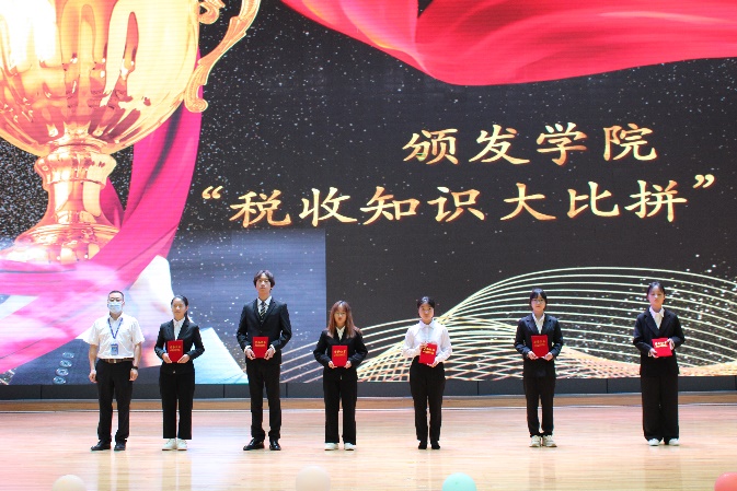党委委员、工商管理学院党总支书记郑代富为税收知识大比拼获奖选手颁奖并合影留念。他们分别是: