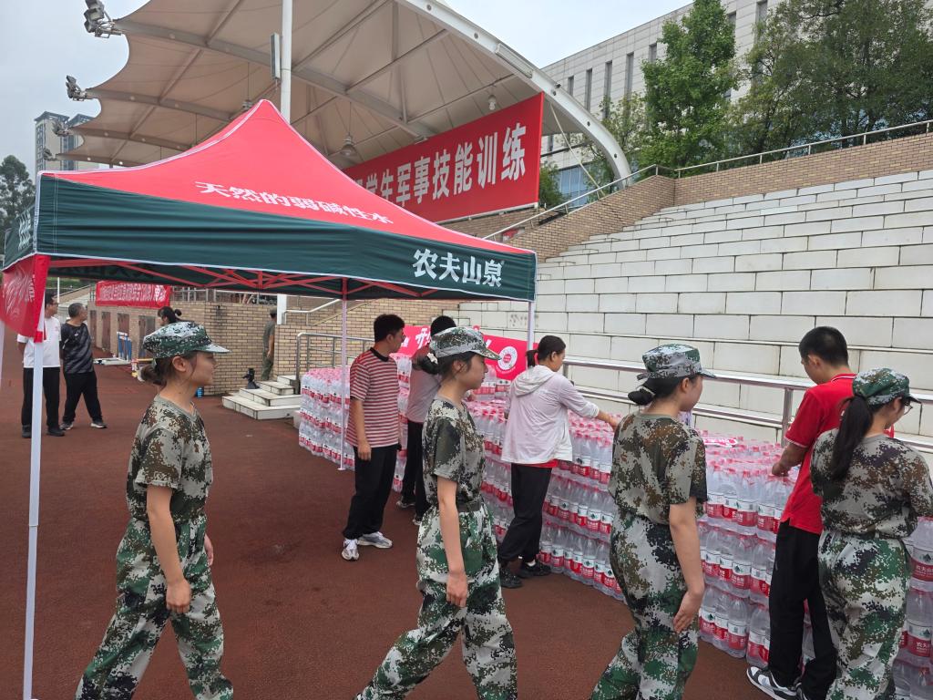 补给站旁,“学生军事技能训练”的红色横幅与“天然弱碱性水”的标识相映成趣。穿着统一迷彩的新生们结伴走过,不少人驻足领取饮用水,工作人员的引导声、瓶身的碰撞声,让严肃的训练场多了几分烟火气。“这是我们和学校合作的‘开学关怀计划’,希望用小小的一瓶水,让新生更快融入校园。”成都华谷商贸的现场负责人介绍道。