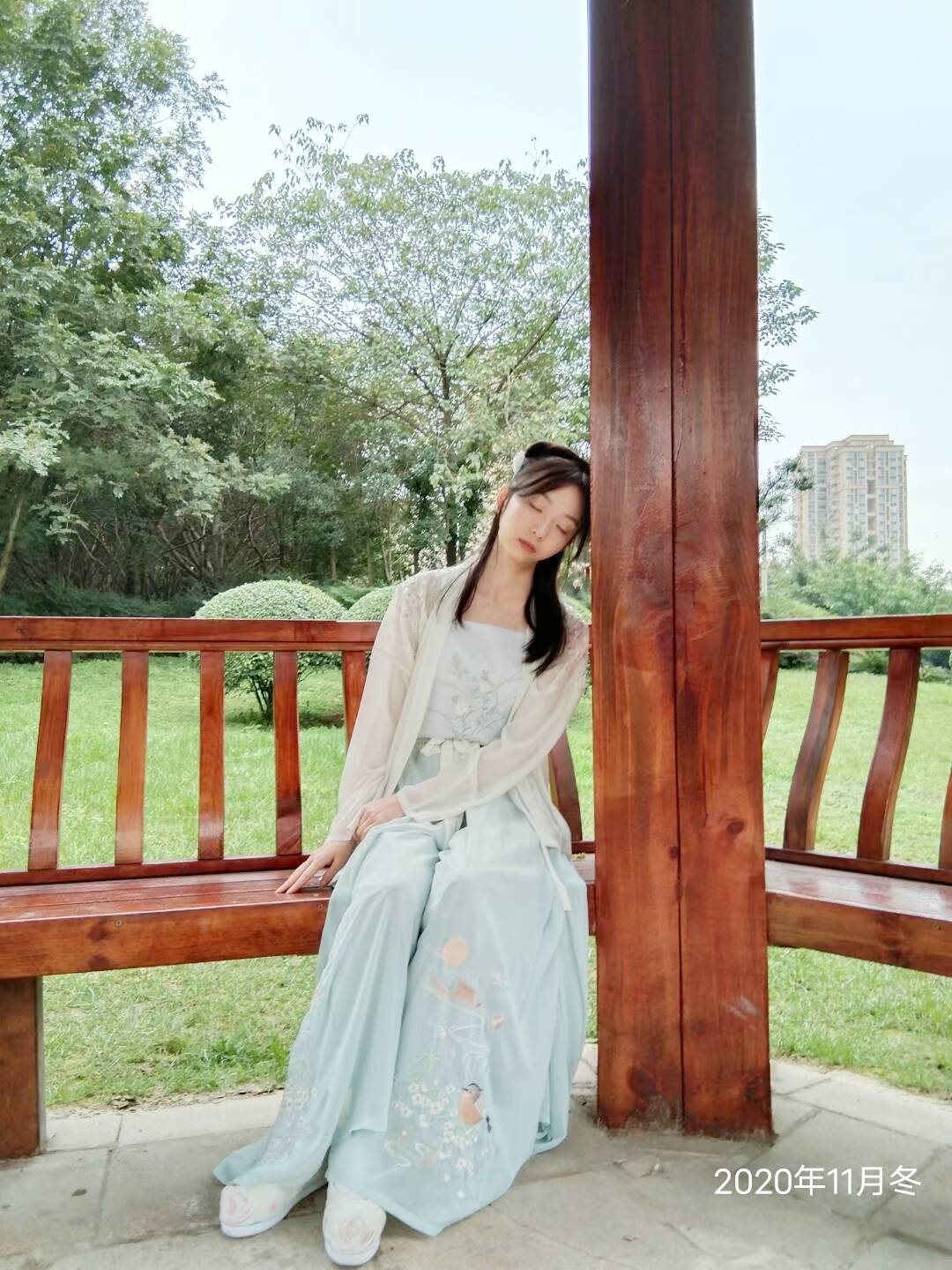 2020年11月,外出做志愿者表演茶艺回来,叫上朋友在校内逛一逛。学校绿化很好,走在绿荫小道里,呼吸着新鲜的空气,置身其中。路过亭子便走去休息一下,缓缓坐下,轻轻靠拢,闭上眼,感受到微微的风轻轻拂过脸庞,又好像闻到青草的清新的味道。冬日里难得的太阳,即使微弱,依旧温暖。