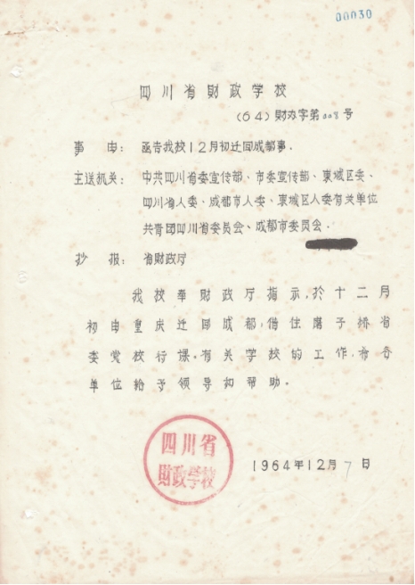 1964年11月29日,由于距离省财政厅较远,诸多不便,省财政厅决定学校由重庆搬回成都市磨子桥省委党校内。借用26间房屋校舍,800多名师生员工安全回到成都市磨子桥。并于1964年12月9日正式行课,采用合班上课。