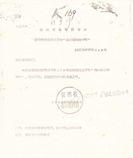 1964年四川省财政学校正式开始招生,于1964年7月10日左右分赴成渝两地,先后开始录取至8月15日胜利结束。因为财政系统急需干部,所以按照财政厅要求,学校招收了三年制中专生403人,1964年应届高中毕业生323人进行短期培训,以迅速补充财政干部的缺额。