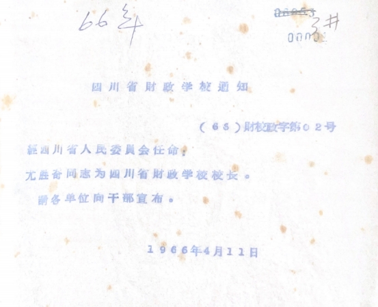 (66)财校政字第02号文件 任命尤胜奇同志为四川省财政学校校长