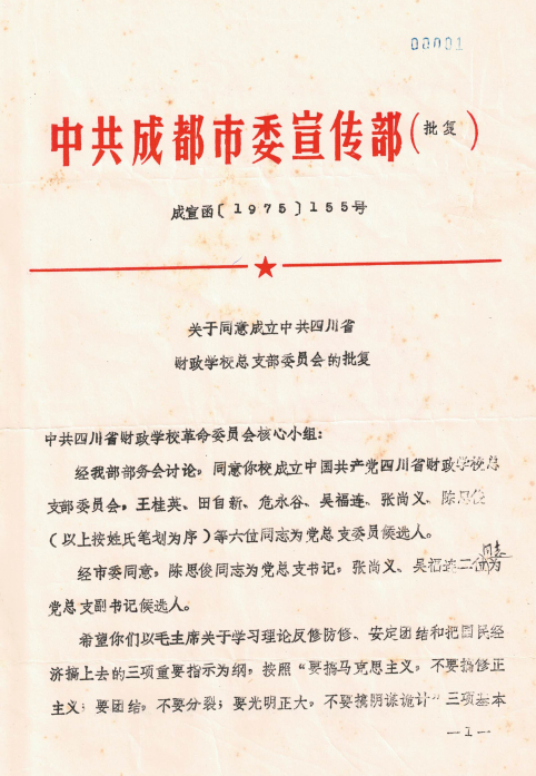 1975年12月5日,中共成都市委宣传部批复同意成立中共四川省财学校总支委员会,由陈思俊同志任党总支书记
