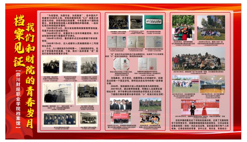 为庆祝中国共产党成立100周年,喜迎第14个国际档案日,档案馆围绕今年档案日主题“档案话百年”,开展了“我和财院的青春岁月”为系列的宣传活动。