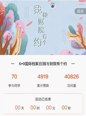 5月13日,档案馆面向全院师生开展“我和财院有个约”照片征集活动,截至5月31日,一共收到了来自814位同学、老师2437份照片视频作品,照片、视频涵盖了师生们的生活、学习、参与活动、实践等内容。经层层筛选,最终确定70张照片参加网评,在6月1日-6月7日进行网上投票评比,累计赞数4919票、访问量40826次、访问人次3996,产生一等奖3名、二等奖6名、三等奖10名、优秀奖24名。