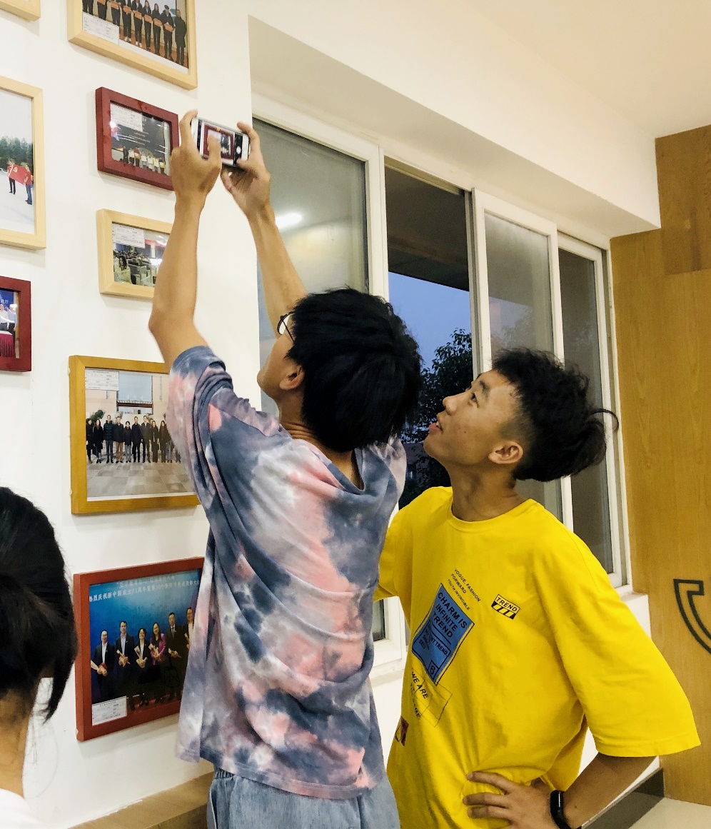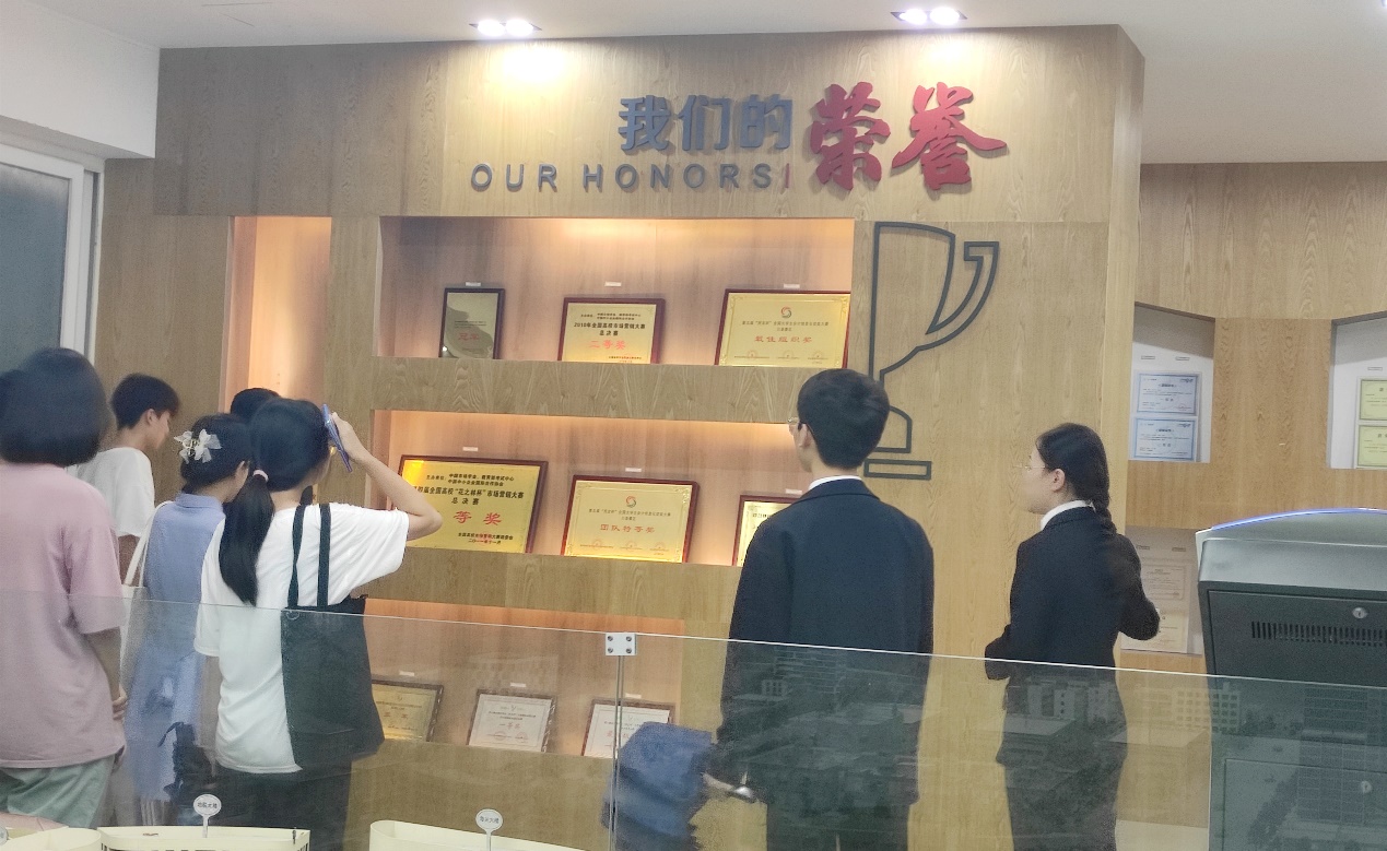 “我们的荣誉”板块展示的是学校师生获得的各种荣誉证书、奖牌和奖杯。其中,信息学院2017级孙煜槟同学于2020年成功申请的实用新型专利令参观的同学们十分敬佩,纷纷拍照留念。