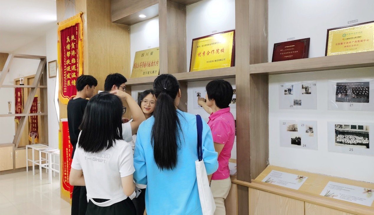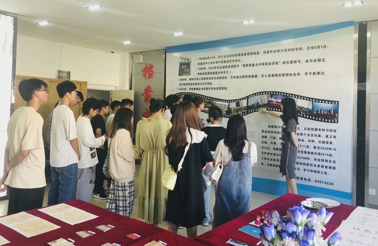 展厅左侧“财院记忆”墙上展示的是师生从1985年至2020年参加的不同层次的各项技能大赛的留影,其中有首届中专学校珠算技能大赛、四川省高职院校各项技能大赛以及在我校举办的全国高职院校各项技能大赛。