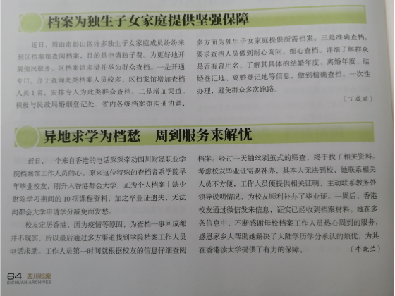 杂志“我为群众办实事”栏目,刊登了档案馆牛晓兰老师《异地求学为档愁 周到服务来解忧》一文。档案馆一直重视发挥档案襄政、存史、育人等功能,先后为天津市公安局、成都市民政局、广安市政协、眉山市彭山区政协、中国人民解放军XX部队参谋部等单位及个人提供关于学籍、入党等各类查档服务。2022年 6月,档案馆牛晓兰接到一位97级校友的咨询电话。该校友毕业后定居香港,担任香港立法会议员办公室职员,为学业进修她申请到香港都会大学学习,正为档案缺失无法入学发愁。牛晓兰想校友之所想急校友之所急,经过多番周折查询,终于为校友提供了相关档案材料作为凭证,帮助校友顺利升入香港都会大学。