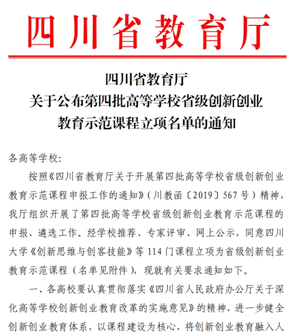公布时间及标题:2020年8月18日四川省教育厅关于公布高等学校第四批省级创新创业教育示范课程立项名单的通知。