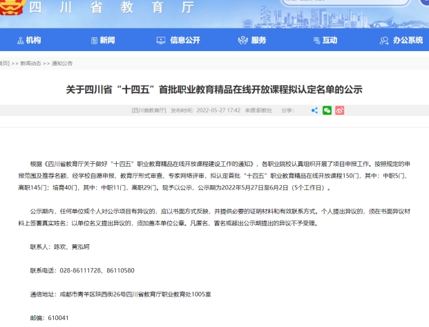 公示时间及标题:2022年5月27日关于四川省“十四五”首批职业教育精品在线开放课程拟认定名单的公示。