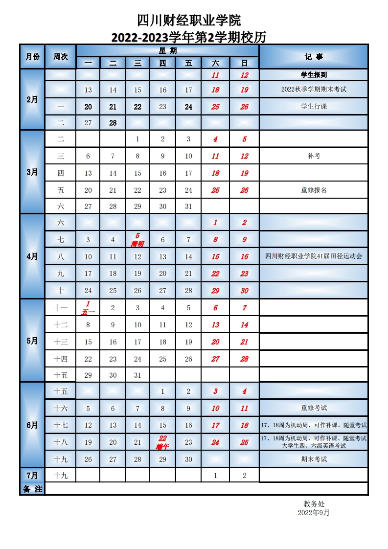2022-2023学年第2学期校历