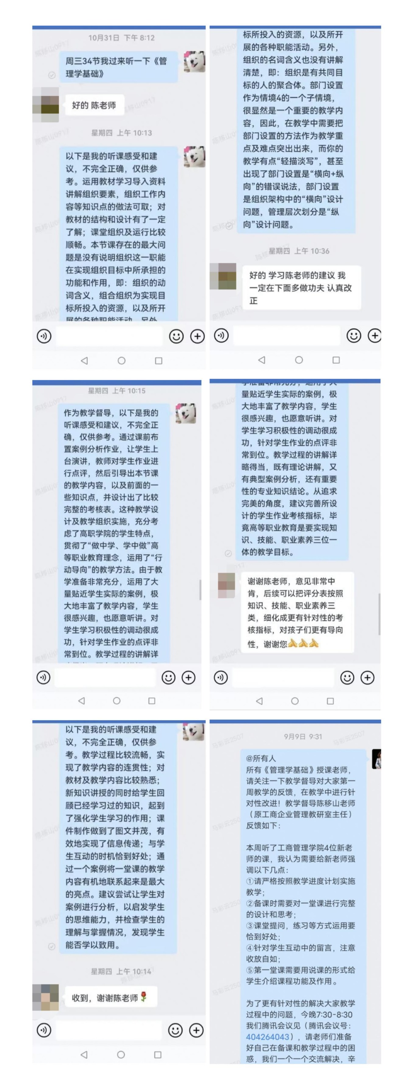工商管理学院针对引进新教师多的情况,为了让新教师快速成长,2022年秋季学期聘请具有40年教学工作经验,课程开发取得丰硕成果的陈移山副教授担任专职教学督导,从时间上、范围上保证督导工作全面开展。学院采用“专职督导+兼职督导”相结合的教学督导方式,充分发挥专职教学督导作用,转变教学督导工作思路,通过听课指导、教研活动指导、预约指导、专题培训等方式,助力教师教学能力快速提升,取得了很好的效果。
