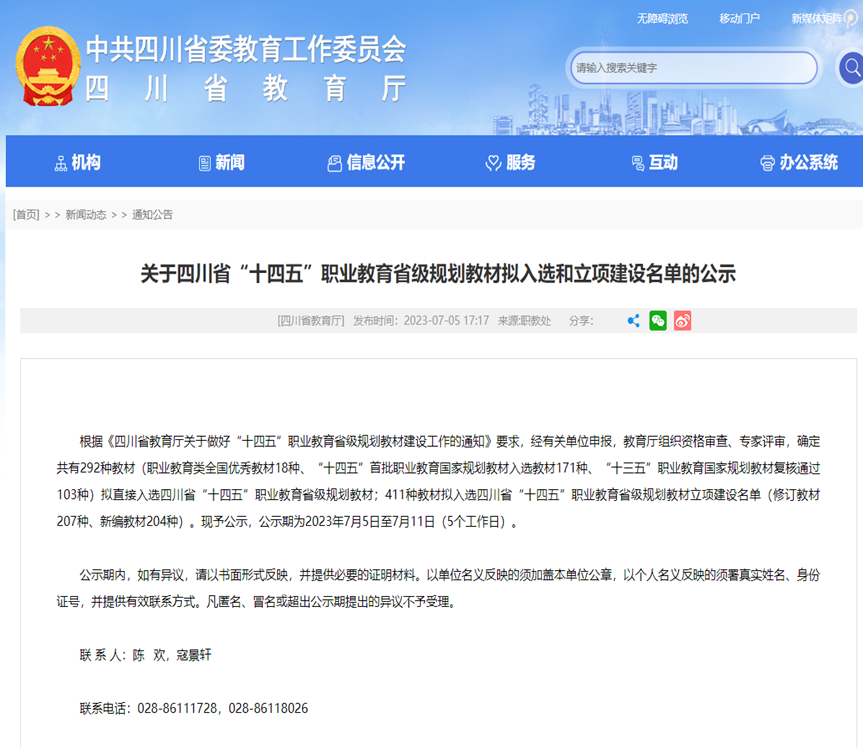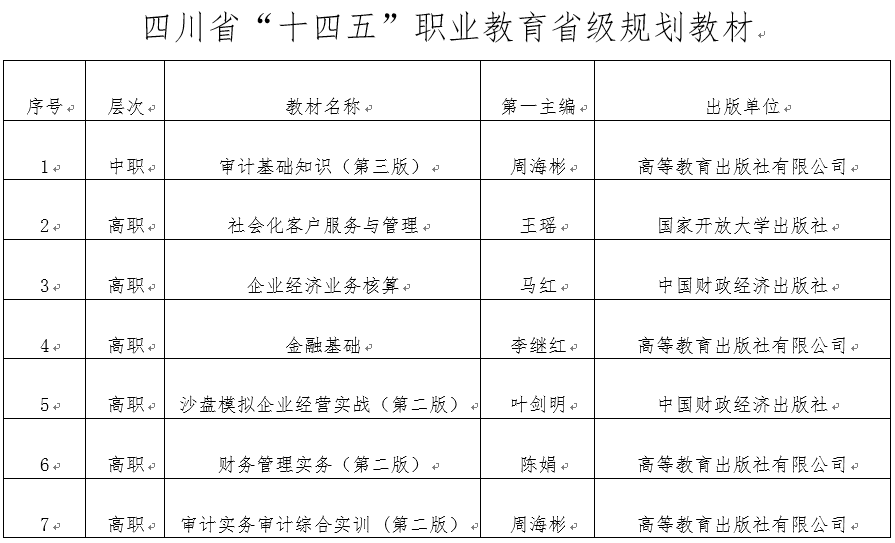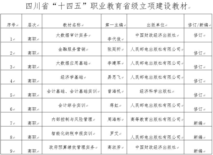 7月8日,四川省教育厅发布了拟入选四川省“十四五”职业教育省级规划教材和立项建设教材公示名单。其中,我校7本教材入选“十四五”职业教育省级规划教材,9本教材(修订教材6本,新编教材3本)入选“十四五”职业教育省级立项建设教材。