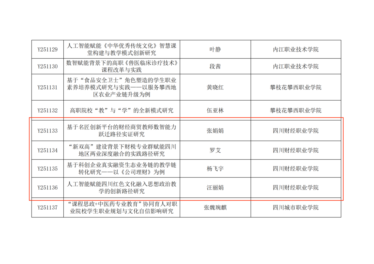 近日,四川省职业技术教育学会公布2025-2026年度职业教育教学改革课题立项名单,我校申报的6项课题全部成功立项,含重点课题2项、一般课题4项。