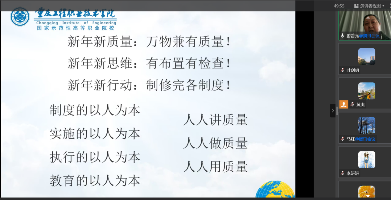 1月30日下午,我校邀请重庆工程职业技术学院教学督导游普元教授围绕教学质量提升和教学督导工作开展以“新质量 新思维 新行动”为题作专题讲座。此次培训采用线上腾讯会议方式进行。学校各二级学院院长、副院长、教学督导、教学干事,以及教务处、组织人事部、教学质量控制与督导中心负责人和有关人员60余人参加培训。本次培训会由教学质量控制与督导中心主任叶剑明主持。