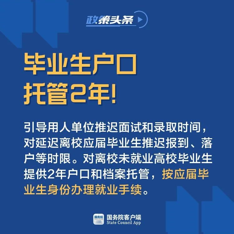25日召开的国务院常务会议指出,扩大硕士研究生招生和专升本规模,增加基层医疗、社会服务等岗位招募。对延迟离校毕业生推迟报到、落户等时限。对离校未就业毕业生提供2年户口和档案托管,按应届毕业生办理就业手续。