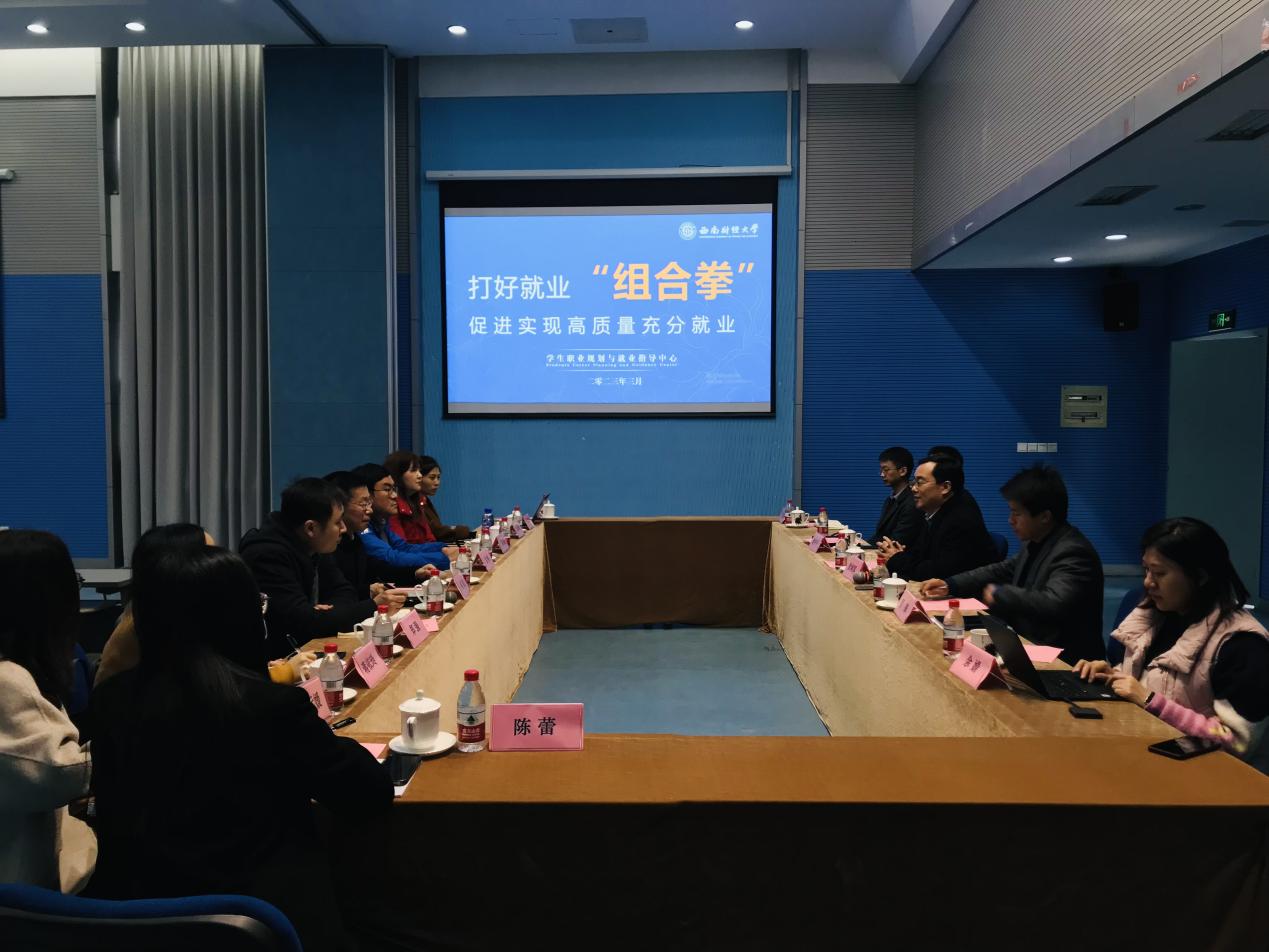中心主任徐利军、副主任罗锋等分别就西南财经大学就业工作理念、部门设置、就业育人、重点群体帮扶、智慧就业平台建设、生涯咨询室建设等进行了经验分享。