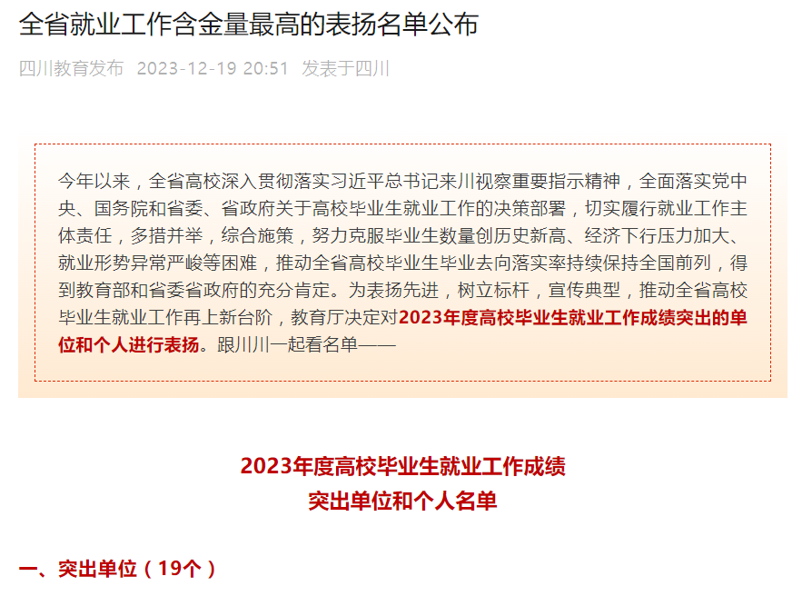 四川省教育厅为表扬先进,树立标杆,宣传典型,推动全省高校毕业生就业工作再上新台阶,决定对2023年度高校毕业生就业工作成绩突出的单位和个人进行表扬。
