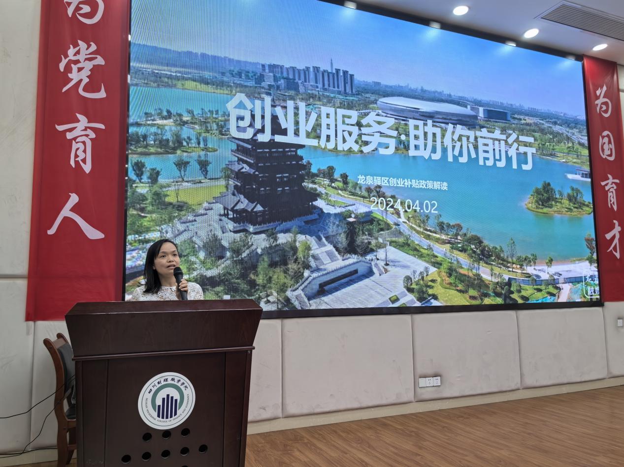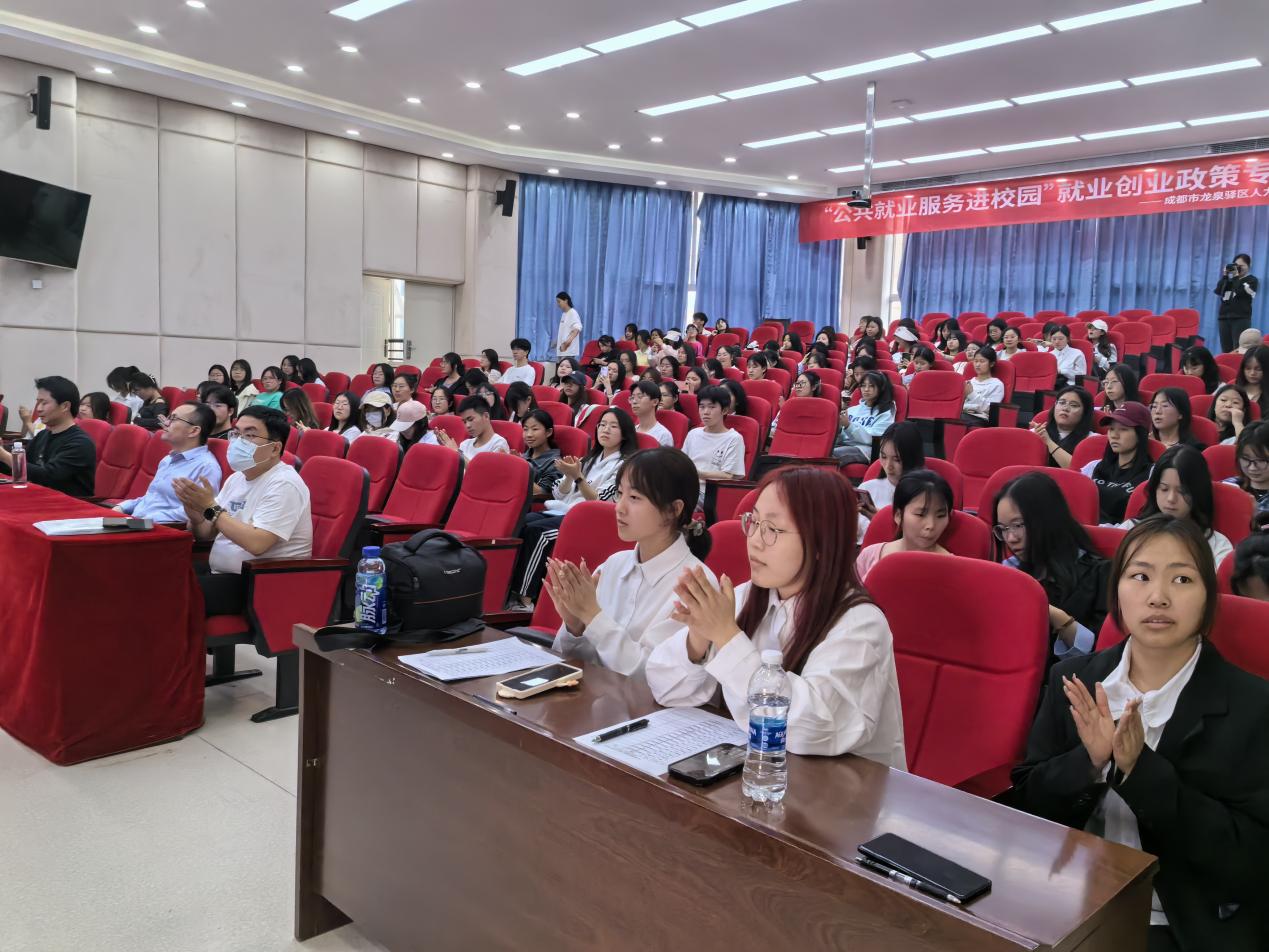 此次活动邀请成都市龙泉驿区人力资源和社会保障局审核科科长唐涛和成都市龙泉驿区人力资源和社会保障局创业扶持政策专家王琼为学生们进行高校学生就业创业政策宣讲与案例解读。