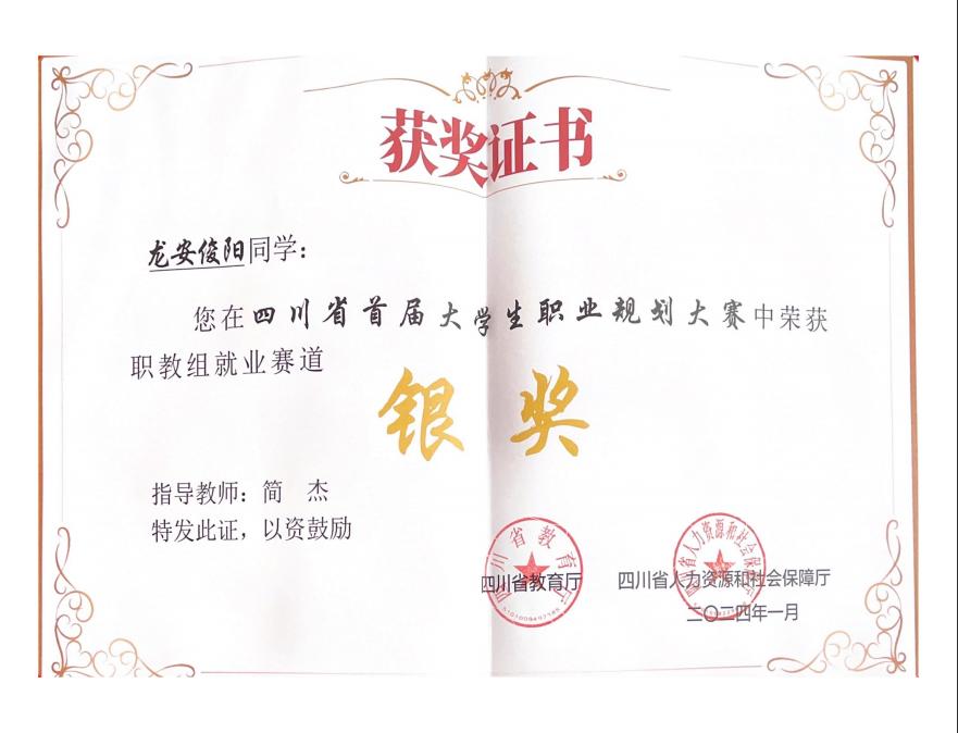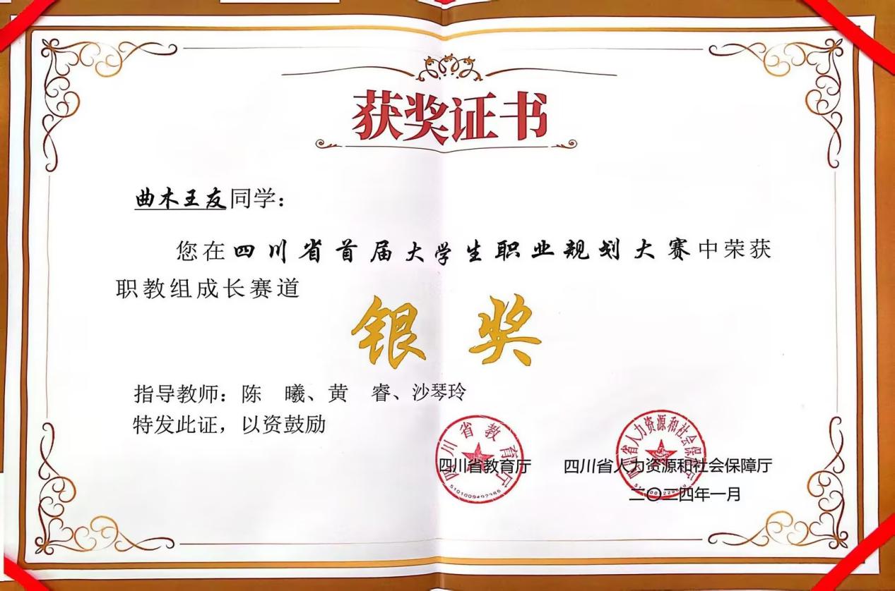 4月12日,我院招生就业处副处长黄睿带领指导教师陈曦与3名获奖学生参加由四川省教育厅、四川省人力资源和社会保障厅主办的“2024四川省首届大学生职业规划大赛”在四川传媒学院举行汇报展演和颁奖仪式。我院在此次大赛中获得佳绩,其中由陈曦、黄睿、沙琴玲老师指导的曲木王友获成长赛道职教组银奖,简杰老师指导的龙安俊阳和黄睿、陈曦老师指导的杨依培分别获得就业赛道职教组的银奖和铜奖。