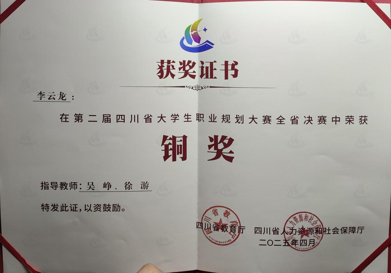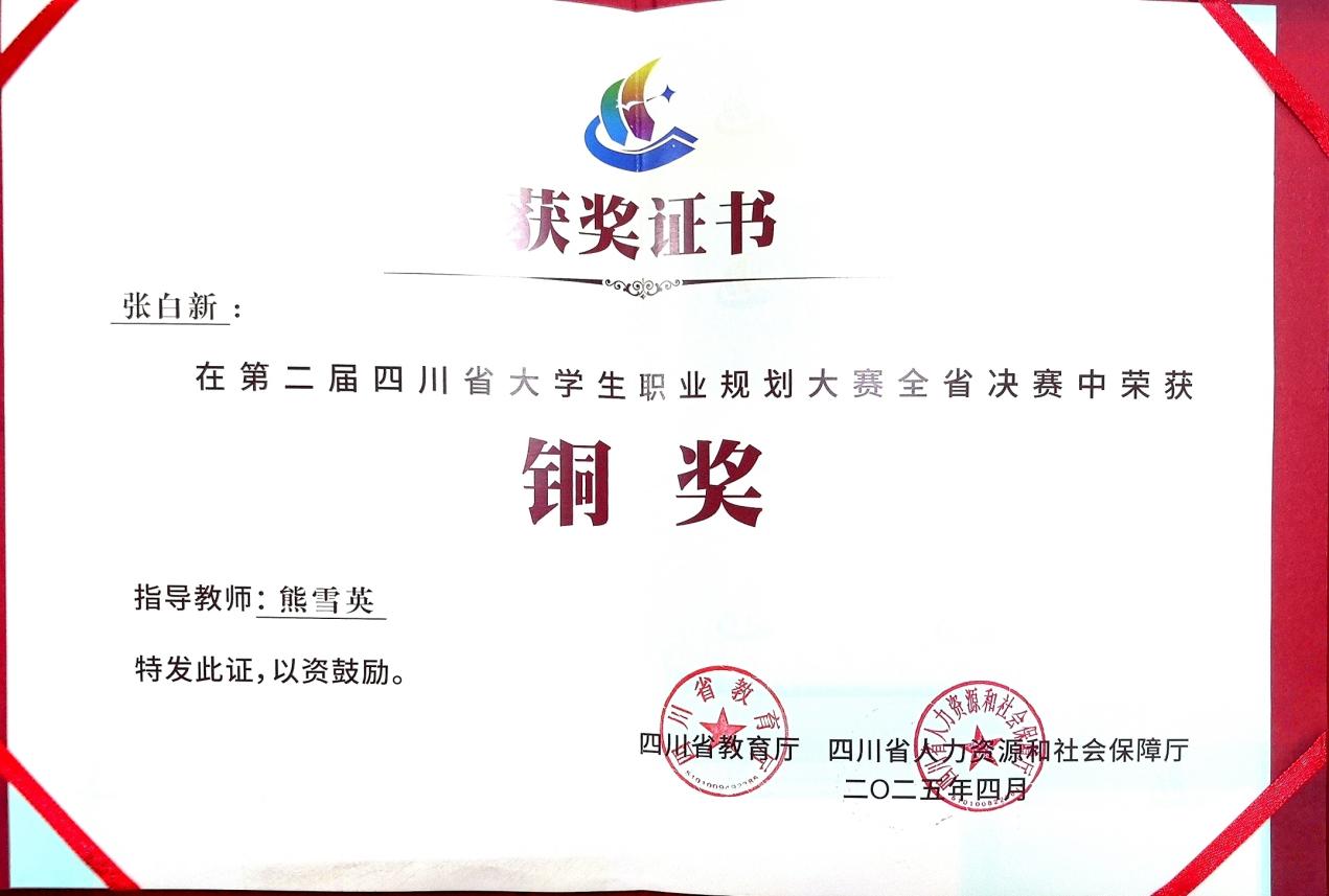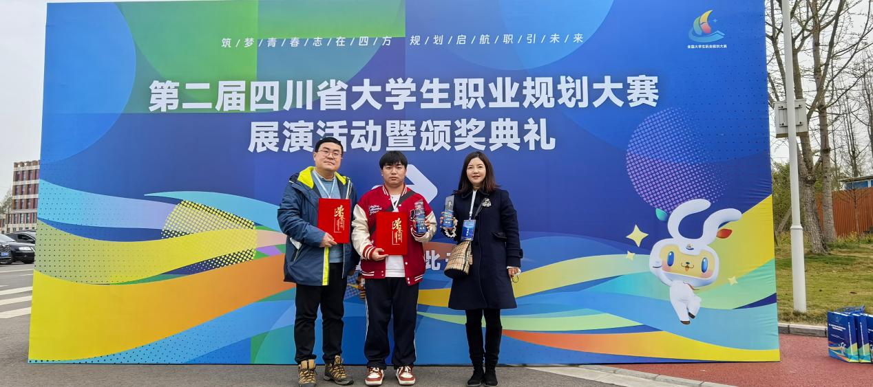 2025年4月2日,四川省第二届大学生职业规划大赛展演活动暨颁奖典礼在四川传媒学院圆满落幕。7790cnm必发集团招生就业处副处长黄睿、招生就业处就创业指导教师陈曦以及获奖学生代表李云龙出席活动。我院在此次大赛中斩获两枚铜奖,由吴峥、徐游老师指导的李云龙获成长赛道职教组铜奖,由熊雪英老师指导的张白新获就业赛道职教组的铜奖。