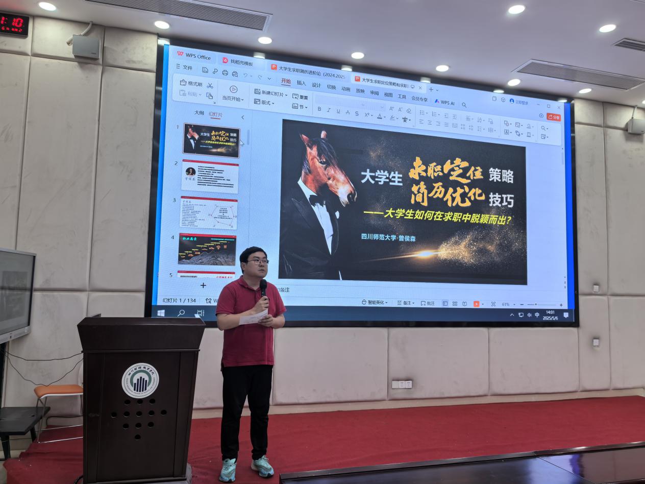 本次讲座特邀四川师范大学体育学院党委副书记、教育部认证全球职业生涯规划师(GCDF)、国际生涯教练认证(BCC)持证人曾侯森老师担任主讲嘉宾。曾侯森老师学术造诣深厚,著有《大学生求职简历进阶论》,且曾获教育部就业指导课件/案例全国奖项、省级教学竞赛一等奖。