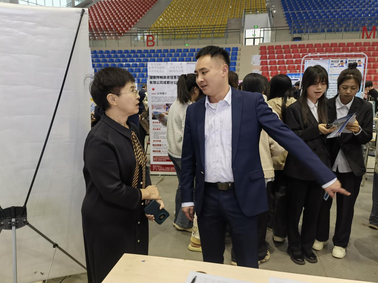 双选会期间,院长符刚、党委委员副院长李代俊深入会场,实地走访各企业展位。在与用人单位交流中,领导们详细询问企业招聘需求、岗位能力要求及行业发展趋势,重点了解企业对学院人才培养质量的反馈,并围绕课程设置优化、实习基地建设、校企合作项目推进等议题与企业负责人深入探讨,为进一步深化产教融合、提升人才培养针对性奠定基础。