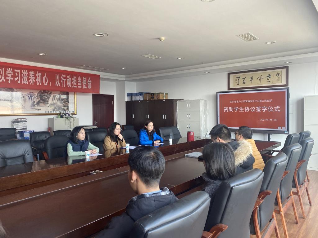 2021年1月18日,四川省电力公司营销服务中心第三党支部与工商管理学院两位受经济资助学生在明德楼413会议室举行了资助签字仪式,工商管理学院党总支书记、学生党支部书记、辅导员老师参加了资助签字仪式。