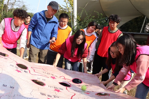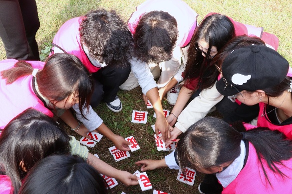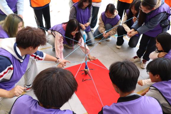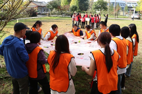 下午,丰富多彩的系列主题协作项目拉开帷幕。“重走长征路”活动中,50名成员分组合力托举长征路线地图,沿红一方面军行进路线平稳运送网球,在反复磨合中锤炼配合默契;“神笔马良”挑战里,各小组成员牵拉绳索操控毛笔,共同书写“天天向上”等正能量词语,在协作中提升专注力;“二十四字社会主义核心价值观拼字”比拼环节,大家争分夺秒完成拼字任务,充分展现团队应变能力与知识储备。一系列的活动有效强化了成员们的团队协作与执行能力。