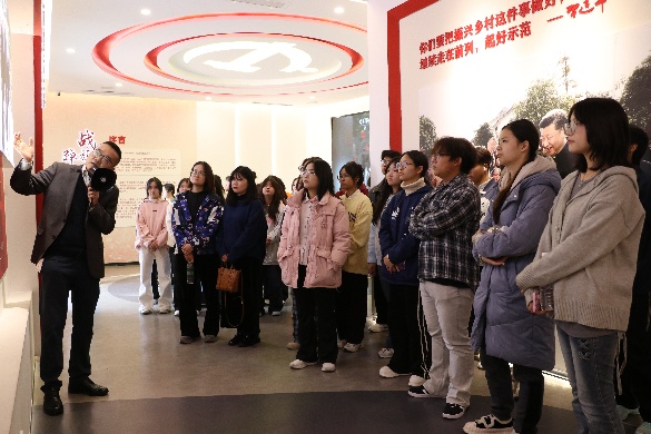 离开烈士陵园,队伍赴战旗村开展实地研学。在当地村民的专业讲解下,沿“战旗文化广场—初心馆—党群服务中心—乡村十八坊”的乡村振兴路线参观学习,详细了解习近平总书记视察过的村庄,如何以“党建引领、集体带动、改革赋能、产业发展”的“战旗模式”实现乡村蝶变。为我院川商学子的专业知识实践应用积累了鲜活案例。在初心馆,老照片与实物展品生动展现了该村以红色党建引领乡村振兴的发展脉络;在党群服务中心,“网格化治理+便民服务”的创新模式让同学们深受启发;走进乡村十八坊,大家深入了解工坊联动本地产业、带动村民就近就业的运营机制,直观感受红色文化与乡村振兴深度融合的丰硕成果。
