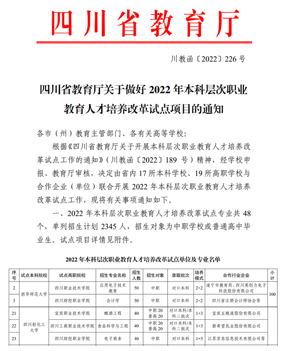 4月20日,四川省教育厅发布“川教函【2022】189号”文件,为贯彻落实《中共中央办公厅、国务院办公厅关于印发<关于推动现代职业教育高质量发展的意见>的通知》精神,加快完善我省现代职业教育体系,积极探索高层次技术技能人才培养改革,切实增强职业教育适应性,决定继续开展本科层次职业教育人才培养改革试点工作,应用型本科高校、国家和省级高水平高职学校与优质企业可联合开展试点,由试点的高职院校、本科高校和企业联合培养。以开展合作的本科高校名义招生,毕业后颁发本科高校毕业证书。