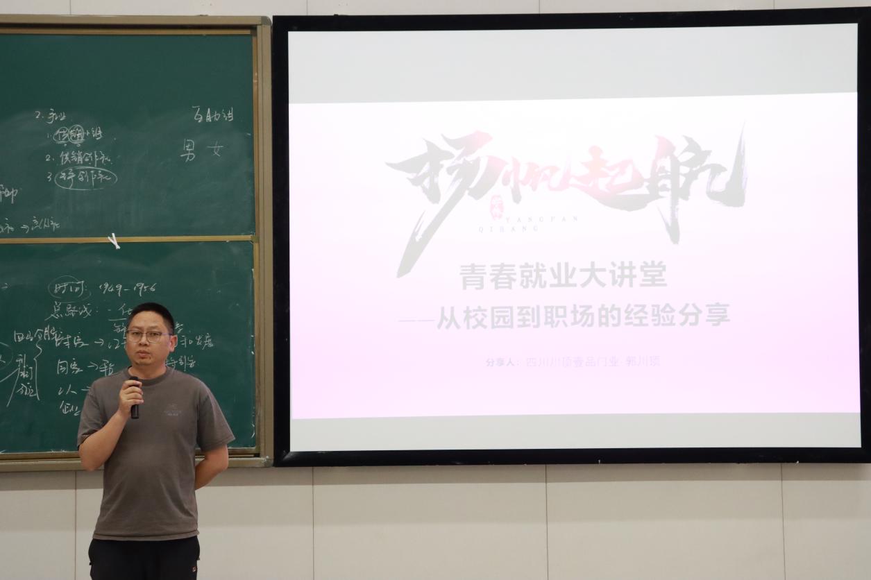 为帮助我校学子明确职业规划,树立正确就业观。2025年5月6日14:30,工商管理学院于至诚楼B208举行“青春就业大讲堂-从校园到职场的经验分享暨学长/学姐领航”讲座,邀请了2007级校友四川川顶壹品门业郭川顶主讲。