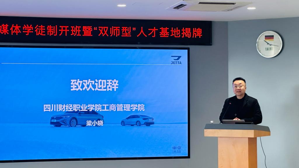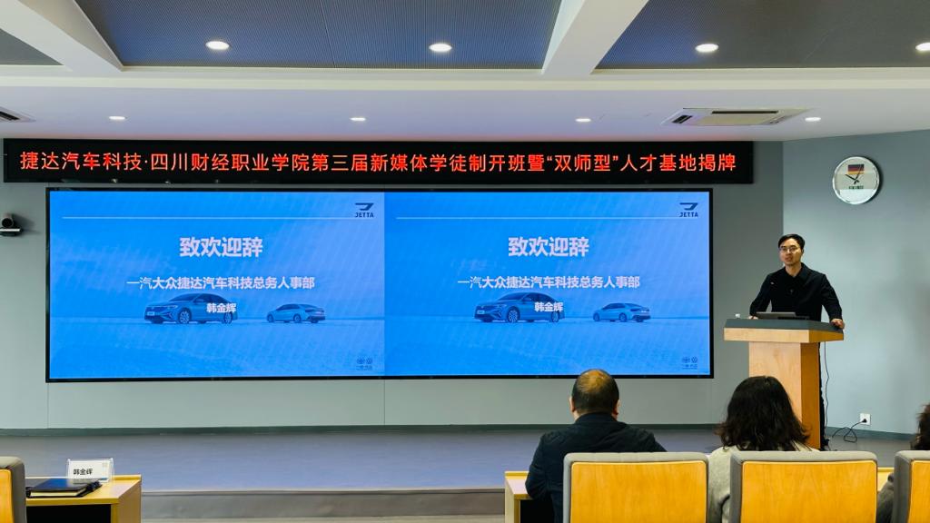 仪式上,捷达汽车科技新媒体学院主管罗月伶详细介绍了新媒体项目班的培养方案与日常管理细则,明确了课程设置、实践安排、考核标准等核心内容。据悉,该项目班采用“双主体”协同育人机制,校企联合制定人才培养方案,将企业真实项目融入教学全过程,实行“项目主导、导师负责”及“师傅+徒弟”的训练模式,由校内专业教师与企业实战导师共同组成“双导师”队伍,全程指导学生学习与实践。捷达汽车科技新媒体项目运营经理姚旺则围绕企业新媒体运营体系、直播电商实操、短视频创作等内容,为在场学员介绍了行业发展趋势与实战技巧,让学员对未来的学习和职业发展有了更清晰的认知。