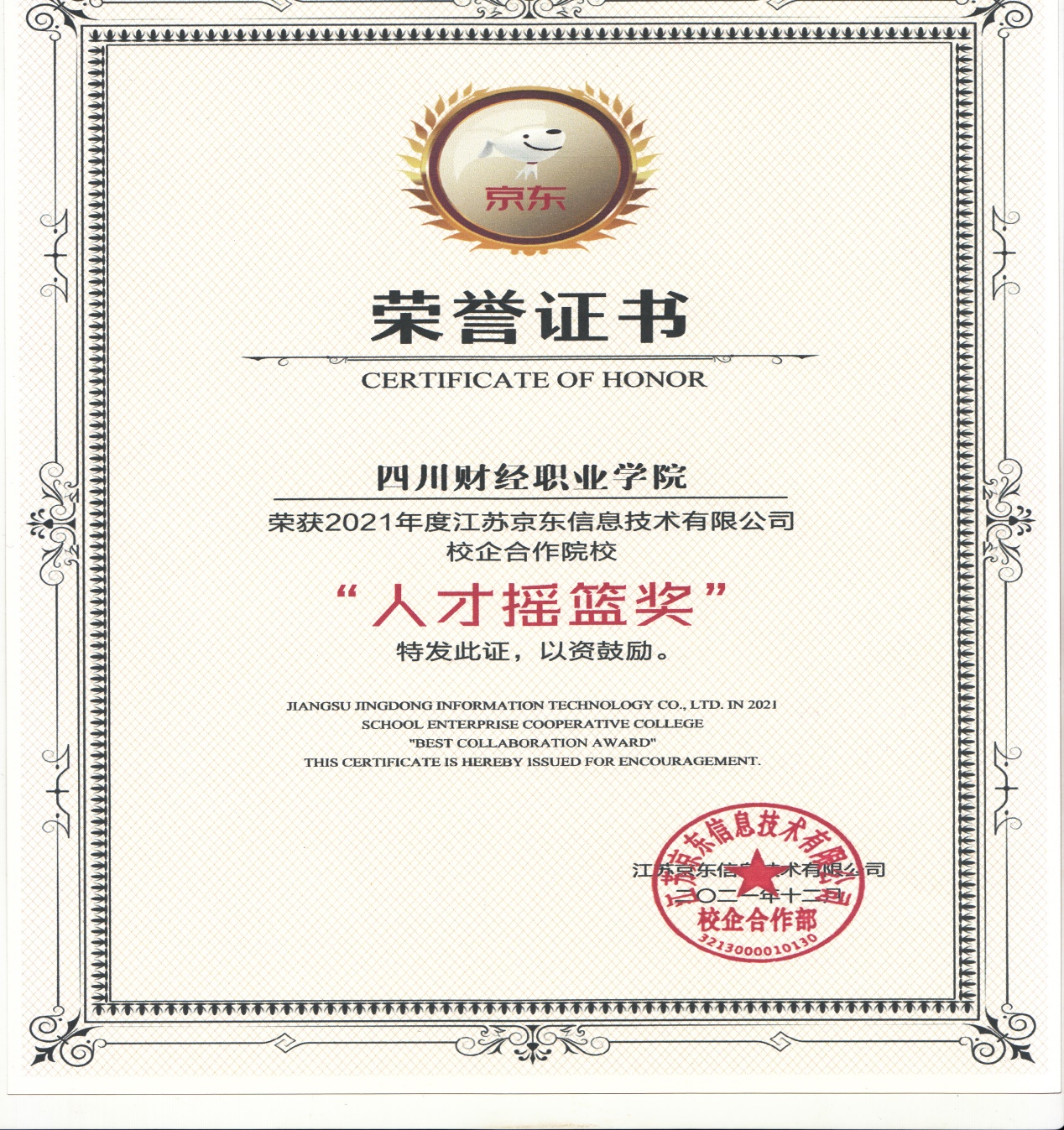 2022年1月13日,京东商城授予我院“人才摇篮”,以表彰我院在2021年新冠疫情期间坚持不懈培养优秀学生方面的贡献。