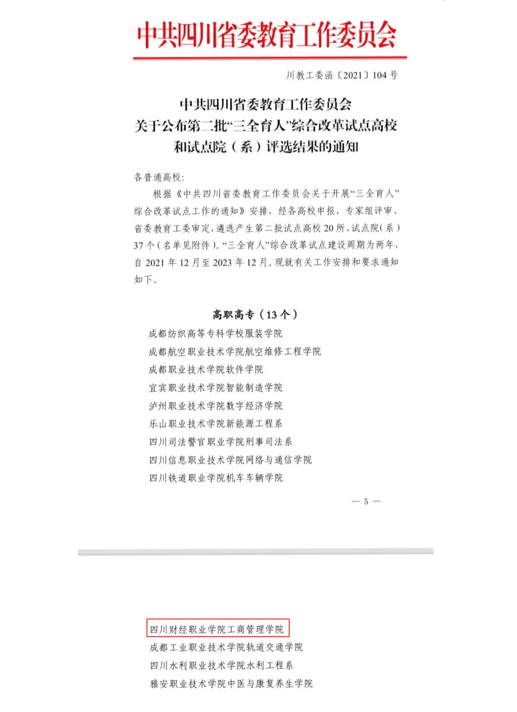 近日,中共四川省委教育工作委员会公布了第二批“三全育人”综合改革试点高校和试点院(系)名单,我校工商管理学院申报的《以义立信,以商载道,构建新商科特色的三全育人体系》成功立项。