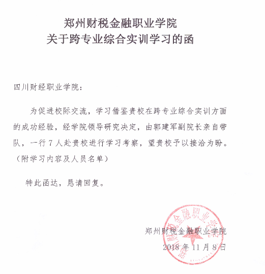 郑州财税金融职业学院作为我院的友好兄弟院校,2018年11月,由郭建军副院长带队,组织了7位老师来我院参观多专业综合实训基地,部分老师全程跟班《多专业综合实训》课程学习。在两校的合作交流过程中,已在人才培养模式、课程教学改革、师资团队等方面进行了互助合作和资源共享。随着两校的交往不断深入,今后将开展更多领域、更深层级的交流合作,在相互借鉴、共谋发展中携手职业教育高质量发展之路!