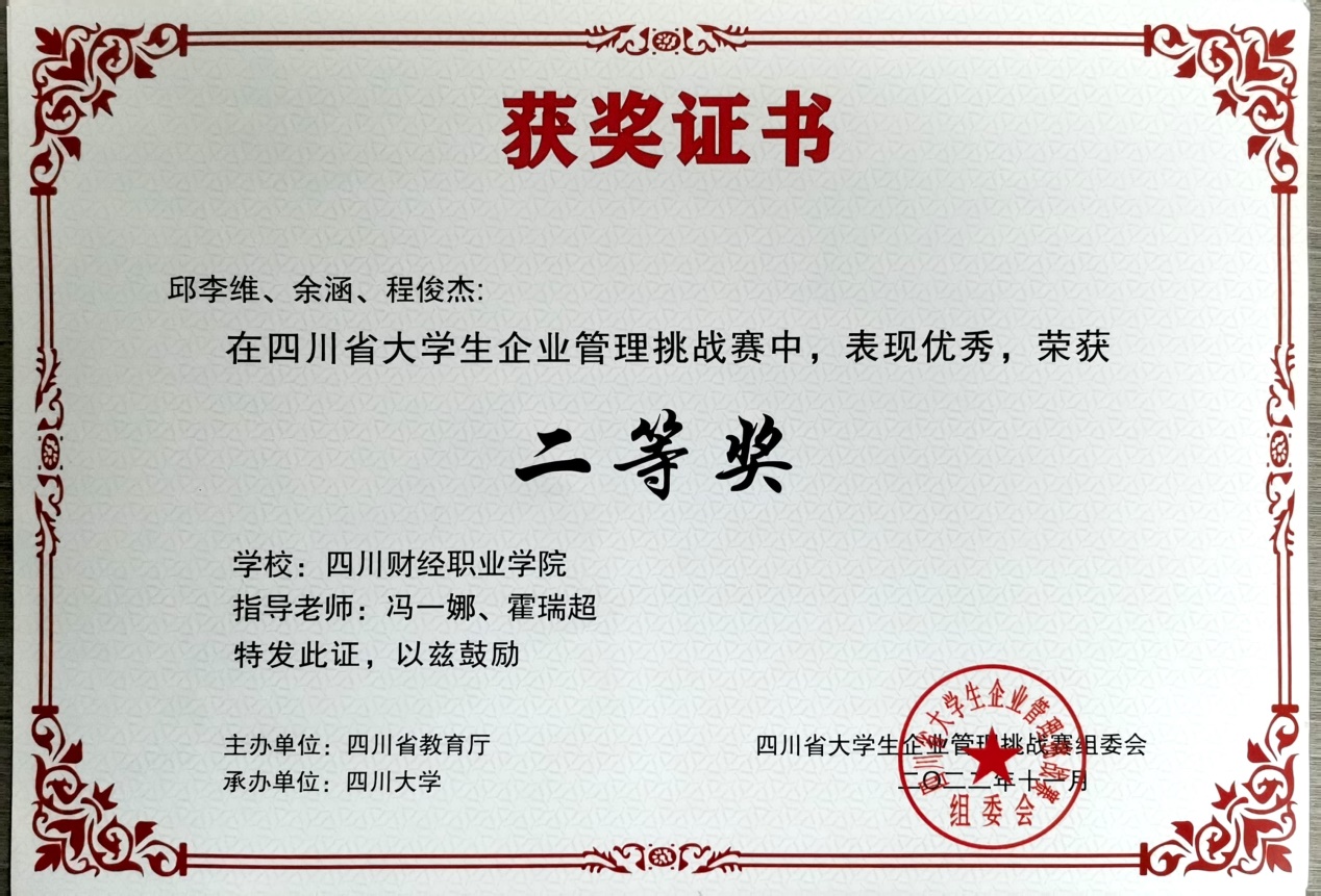 2022年11月20日,我院选派5支代表队参加由四川省教育厅主办、四川大学承办的“2022年四川省大学生企业管理挑战赛”,荣获1个二等奖、4个三等奖。