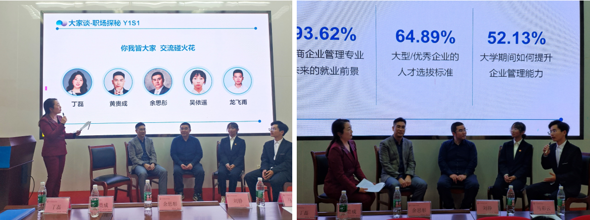 演讲结束后,丁磊博士邀请两位嘉宾及现场的两名学生代表吴依遥和龙飞甫上台,和嘉宾们一起交流分享现场学生们感兴趣的话题。交流分享基于活动前由管理教研室发起的调查问卷进行,针对同学们最感兴趣四个话题—工商企业管理专业的就业前景(93.62%)、优秀企业人才选拨的标准(64.89%)、大学期间如何提升企业管理能力(52.13%)、大学三年如何实现个人价值增值(44.68%)进行了深入的交流,同学们也针对自己感兴趣的时间管理、个人成长等问题进行了现场提问。