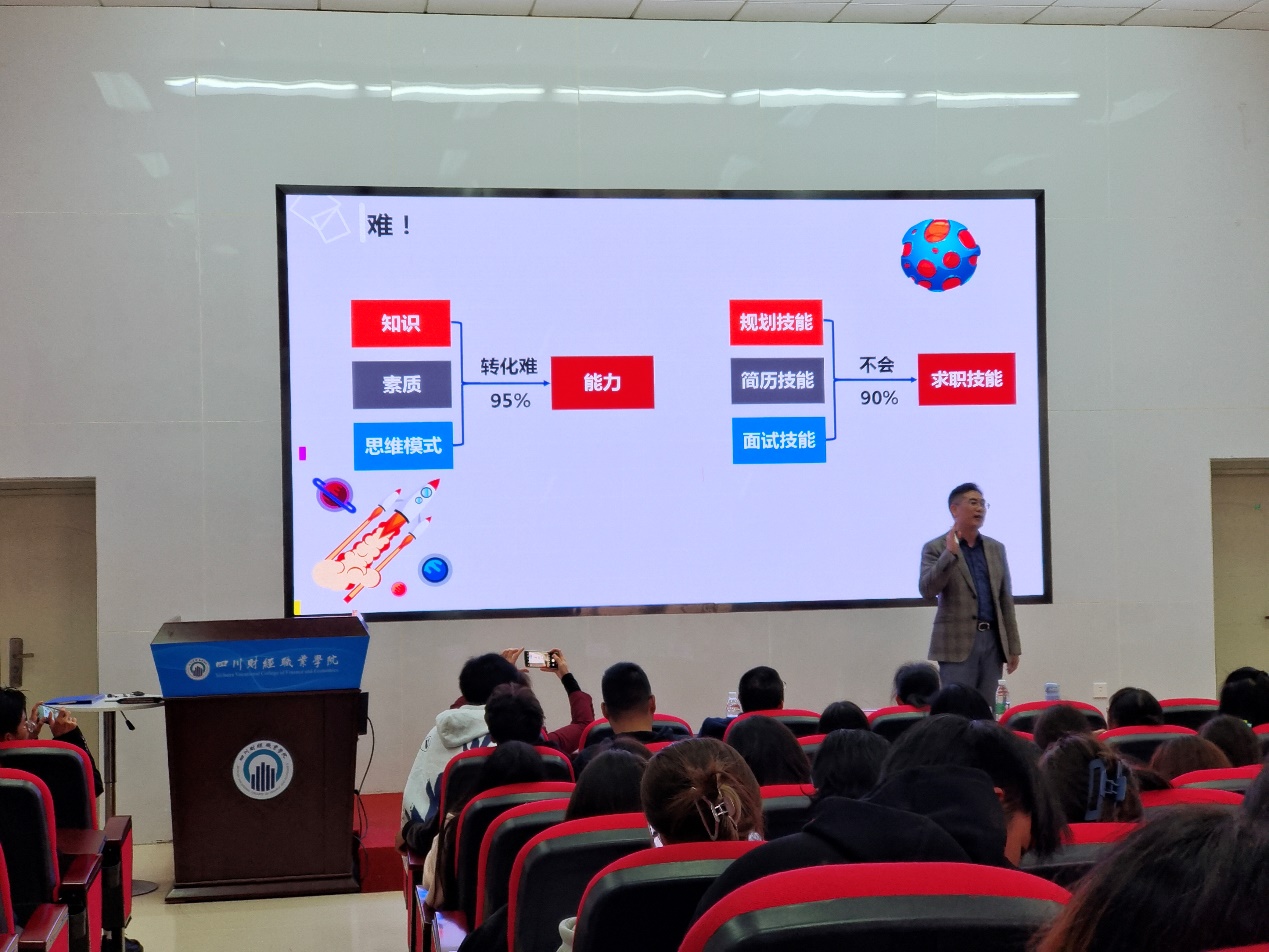 成都执行百分百企业营销策划有限公司创始人黄贵成老师,针对大学生如何在毕业后找到满意的工作进行了具体指导,从大学应届毕业生在知识、素质、思维模式转化为职场所需要的能力的困难出发,对大学生的规划技能、简历技能、面试技能三个方面进行了详细地指导,一步一步地教学生如何在求职中展示自己的亮点,从众多求职者脱颖而出,学生纷纷表示在职业规划、简历撰写、面试准备三方面收获很大。