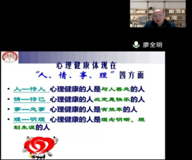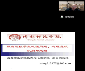 讲座中,廖全明教授主要从五个方面开展分享:第一,我国职业院校学生心理问题现状;第二,职业院校学生心理问题的判断标准;第三,职业院校学生常见的心理问题;第四,目前大学生心理危机问题的现状与原因;第五,大学生危机干预对象与策略等。廖教授带来的分享,非常有针对性且生动具体。参会的老师和心理委员都觉得受益匪浅。