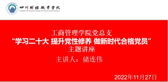2022年11月27日上午,工商管理学院党总支举行“学习二十大 提升党性修养 做新时代合格党员”主题讲座,邀请四川省委党校储连伟副教授为二级学院全体教职工、学生党员、入党积极分子在内的近2000名师生进行了理论宣讲。