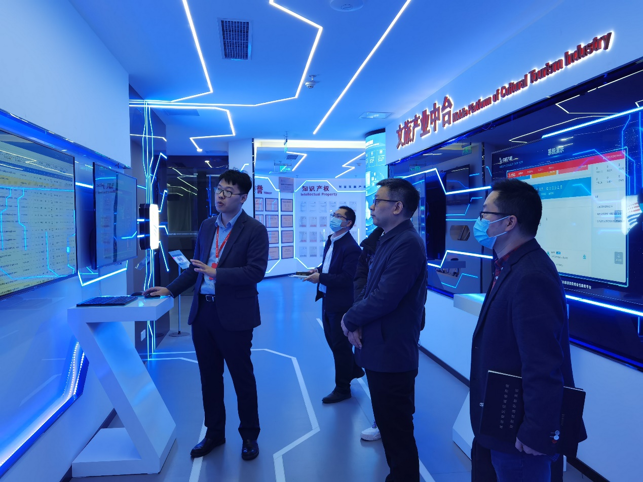 符刚副院长在中科大旗董事长助理丁钢颖陪同下参观了中科大旗数字化云展厅,了解公司的发展历程、专利技术以及文旅产业中台、营销服务、公共服务和企业管控等特色产品。
