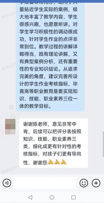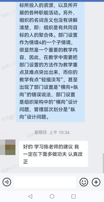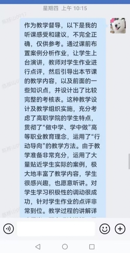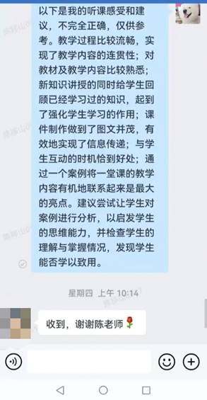 3. 专职督导听完课后,主要用评语的形式对教师授课进行全面完整的评价,提出改进意见及建议,由督导直接反馈给相关教师,这样就避免了督导意见间接反馈,可能会造成的信息失真。与此同时,新教师可以在第一时间得到反馈意见和建议,便于教师迅速改进和提高;