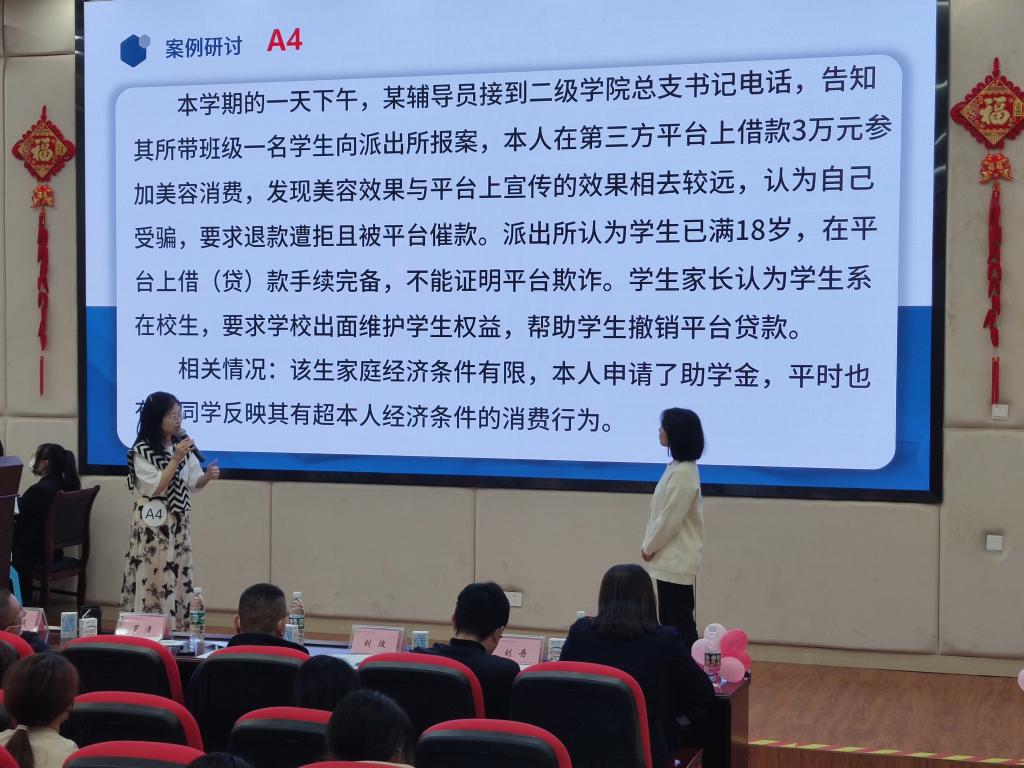比赛中,各位辅导员紧扣案例主题,根据案例或明或暗的提示,紧扣问题关键,结合教育管理法规和个人工作经验共同开展案例研讨。提问方就案例可能存在的管理缺位、潜在风险提出,以及矛盾化解、风险防范提出研讨问题;回答者引据案例材料和管理常规,回应研讨问题。双方通过研讨,共同将案例问题的解决思路厘清、措施方法明确,体现了辅导员工作必须坚持的有理、有据、有爱原则。各个辅导员在分析问题的同时也不忘换位思考,设身处地的为同学们考虑,协调有关矛盾。辅导员们结合自身与本班学生的实际情况,思路清晰、逻辑明了,凭借扎实深厚的职业素养,正确得当地处理案例中学生在生活、学习方面遇到的难题。