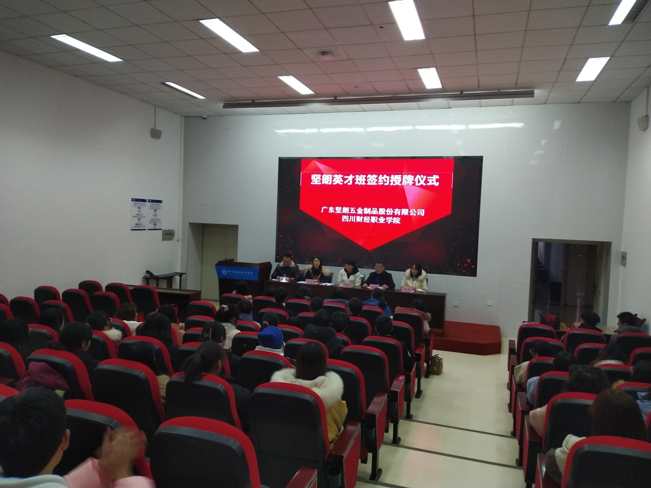 2021年12月30日中午13时,坚朗五金(证券代码:002791)大西南片区总经理成蔚蔚女士、行政主管何佳女士等一行4人到我院参加校企合作签约仪式,同时为“四川财经-广东坚朗市场营销英才班”授牌。