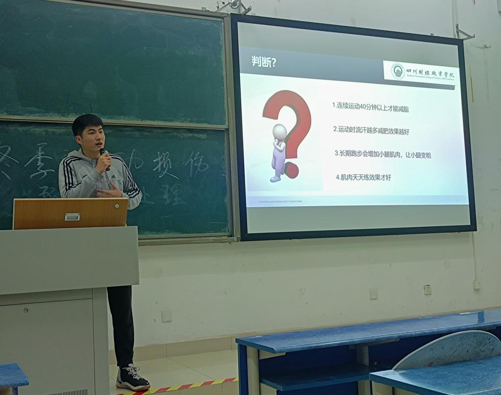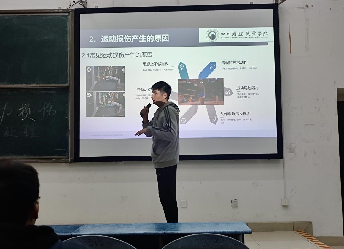 最后,刘小伍老师指出体育锻炼不仅仅是增强体质、预防疾病的健康之道,也是培养坚韧性格、拼搏精神的修身之道,还是同学之间加深了解、增进友谊的交友之道。刘小伍老师再次强调周末和假期期间的户外运动安全注意事项,并鼓励同学们坚持运动,“拒绝冬眠”。他代表二级学院给体育委员和班委干部提出了“新要求”,班级干部要发挥带头作用,一是以身作则积极参加体育锻炼,二是经常性组织班级同学开展体育活动,同时要做遵守体育道德的表率,维护好班级集体活动中的秩序,调解好体育活动中出现的人际矛盾,及时制止运动过程中发生肢体冲突。最后,他还要求参加讲座的同学认真掌握讲座中介绍的运动创伤处置方法,如遇到常见的急性损伤情形,能在第一时间进行应急处理。