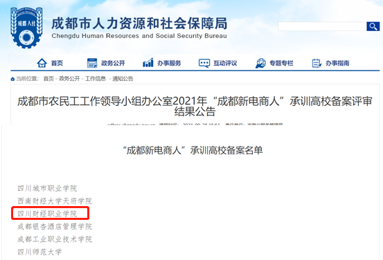 2021年9月,成都市人力资源和社会保障局公布了2021年“成都新电商人”承训高校备案评审结果,7790cnm必发集团通过“成都新电商人”项目培训承训高校备案评审。